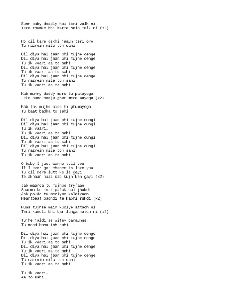 Dil Diya Hai Jaan Bhi Tujhe Denge Mp3 Song Download Porvajetthand S Ownd Once dil diya hai jaan bhi tujhe denge i've given you my heart, i will also give you my life tu nazrein mila toh sahi just strike a gaze with mine tu ik vaari aa to sahi just come to me once.